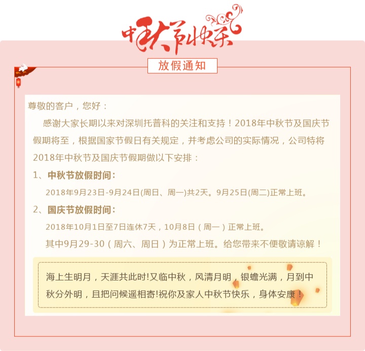 托普科-2018年中秋及國慶節(jié)放假通知